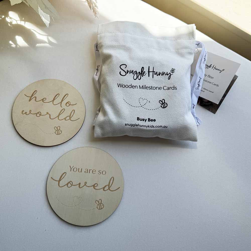 This wooden milestone disc pack contains 14 Reversible milestone cards made from 100% natural basswood timber with the busy bee design - perfect for matching across our prints. There is a different Bee design and message on each side of the disc.