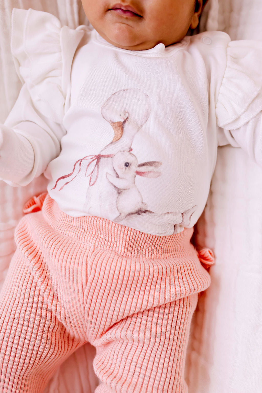 The sweetest print in our Forever Friends range, featuring an adorable goose and rabbit. Perfectly paired with our knitted pants in blush and peach for a charming look.